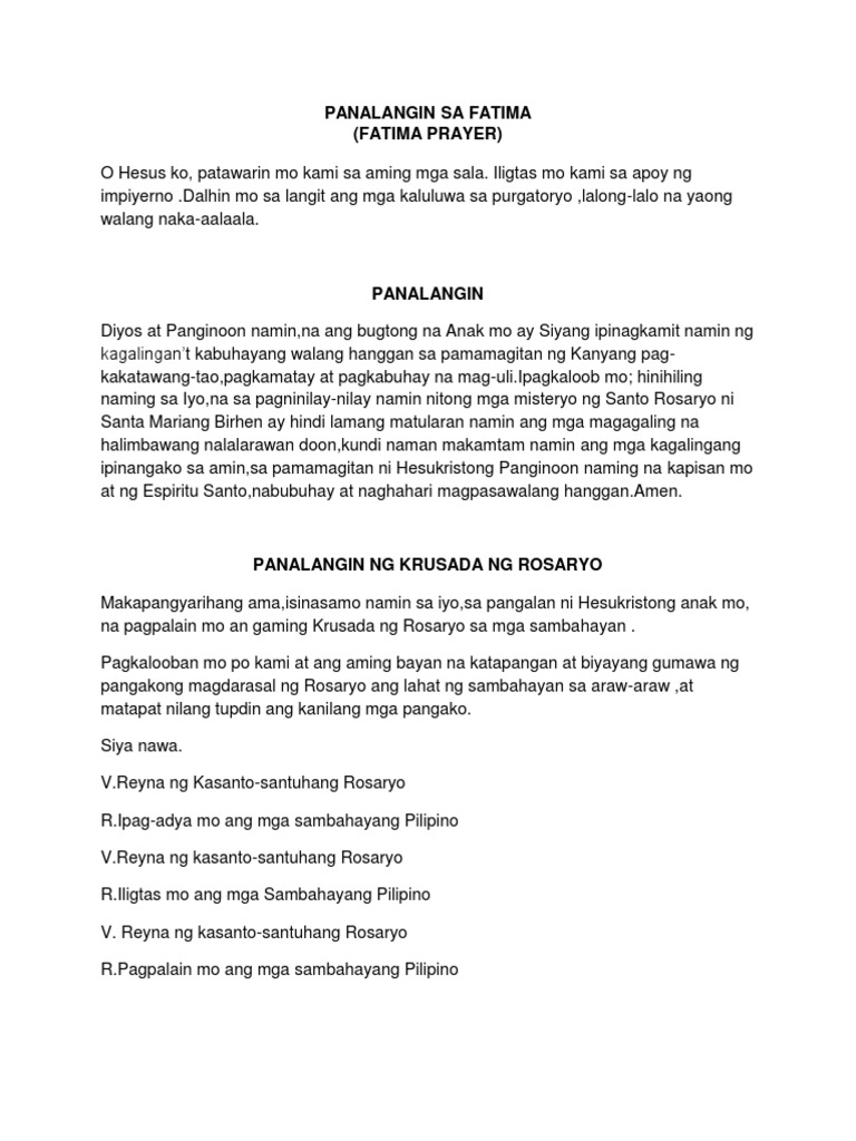 Panalangin ng fatima tagalog. Diyos na makapangyarihan at walang hanggan na lumikha sa amin ayon sa Iyong imahen. Nag-aalala rin si Aling Felising dahil hindi pa umuuwi si Mang Felipe ang kanyang asawa. Yumakap siya sa kanyang inang si Felising.