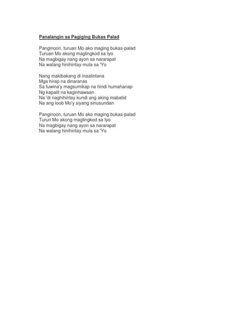 Panginoon turuan mo akong maging bukas-palad Turuan mo akong maglingkod sa Iyo Na magbigay nang ayon sa nararapat Na walang hinihintay mula sa Iyo Na makibakang di inaalintana mga hirap na dinaranas Sa tuwinay magsumikap na hindi humahanap ng kapalit na kaginhawaan At di naghihintay kundi ang aking mabatid na ang loob Moy siyang sinusundan. Turuan Mo akong maging bukaspalad sa Iyoy maglingkod ng karapat-dapat. Get DJ recommendations for harmonic mixing.
