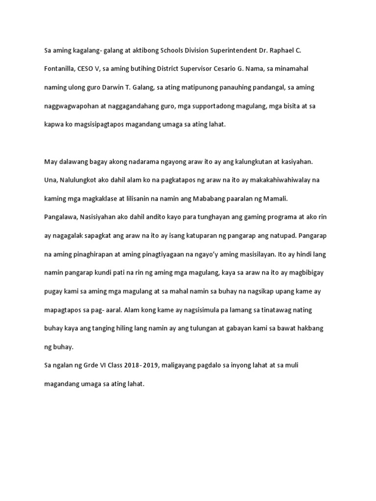 Sa lahat ng ito tanggapin ninyong mga nasa paaralan ang walang haggang pasasalamat naming mga magulang. At sa mga kapwa ko magsisipagtapos. Muliisang maalab na pagbatipo ng magandang hapon sa inyong lahat.