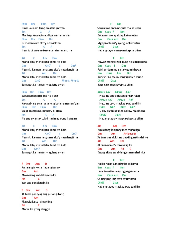 356 55 36 765 Mahal ko iyong dinggin. A-E-D-D9-A-E-D- E A E D D9 A Nais kong mabuhay sa haba ng panahon E D E A Kung itoy lilipas na ikay kapiling ko Fm Ang aking buhay ang aking buhay Esus E D9 Sa yoy ibibigay. D - DU - UDU is the suggested strumming pattern for this Moonstar88 song.